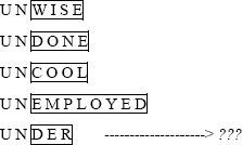 So a student can add to the pronounceable parts of words that she knows by paying attention to common prefixes and suffixes. Learning meanings for these prefixes and suffixes is not necessarily useful at first; it is often better to point out the sight/sound/articulatory/handwriting patterns before analyzing them for meaning. Dharini, a staff person at ALFA, points to the complexity of knowing when a particular sequence of letters is a prefix/suffix, or when it is simply a sequence of letters. For example in UNWISE and UNDONE, UN- is a prefix, but in UNDER, it is not.
